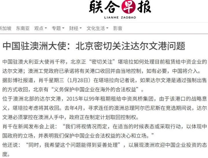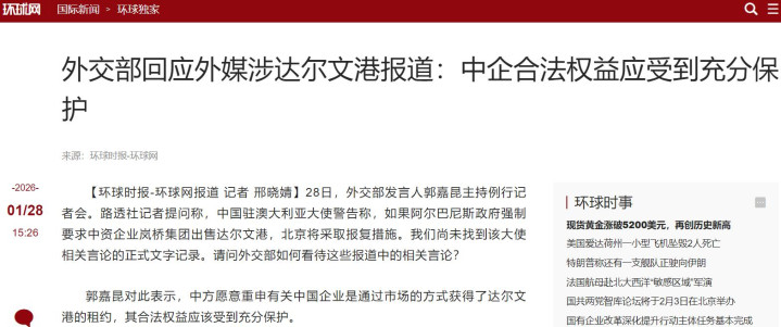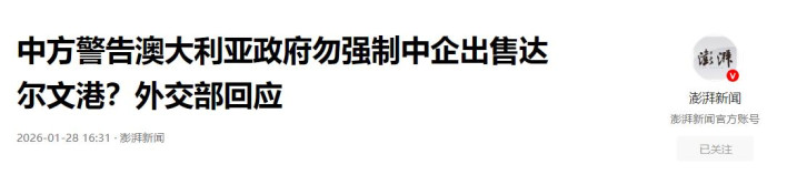 2026-01-28 16:31·澎湃新闻——《中方警告澳大利亚政府勿强制中企出售达尔文港?外交部回应》