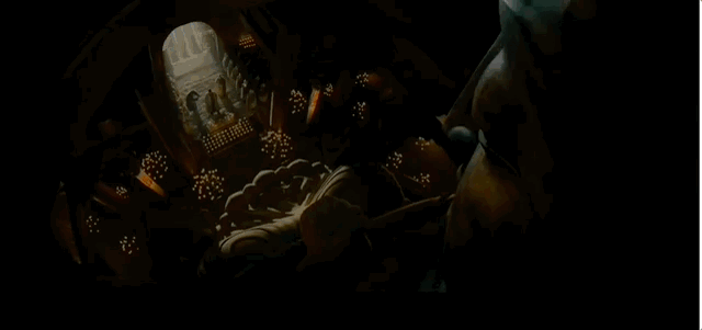 比如那怒目金刚,本是维护世间正义,却顿生为虎作伥的恶鬼既视感;比如从巨佛肩后俯拍下方的人,满是小蝼蚁命运的残酷感;比如右相的轮廓恰恰倒映在佛像眼中,众生和一人,有很错位的互文感。